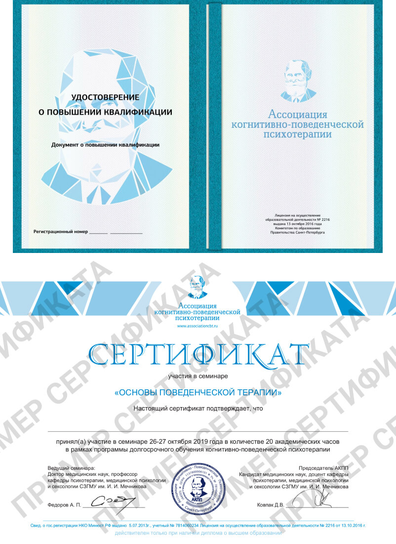 После успешного завершения курса выдается удостоверение о повышении квалификации Ассоциации Когнитивно-Поведенческой Психотерапии в объеме 48 академических часа.